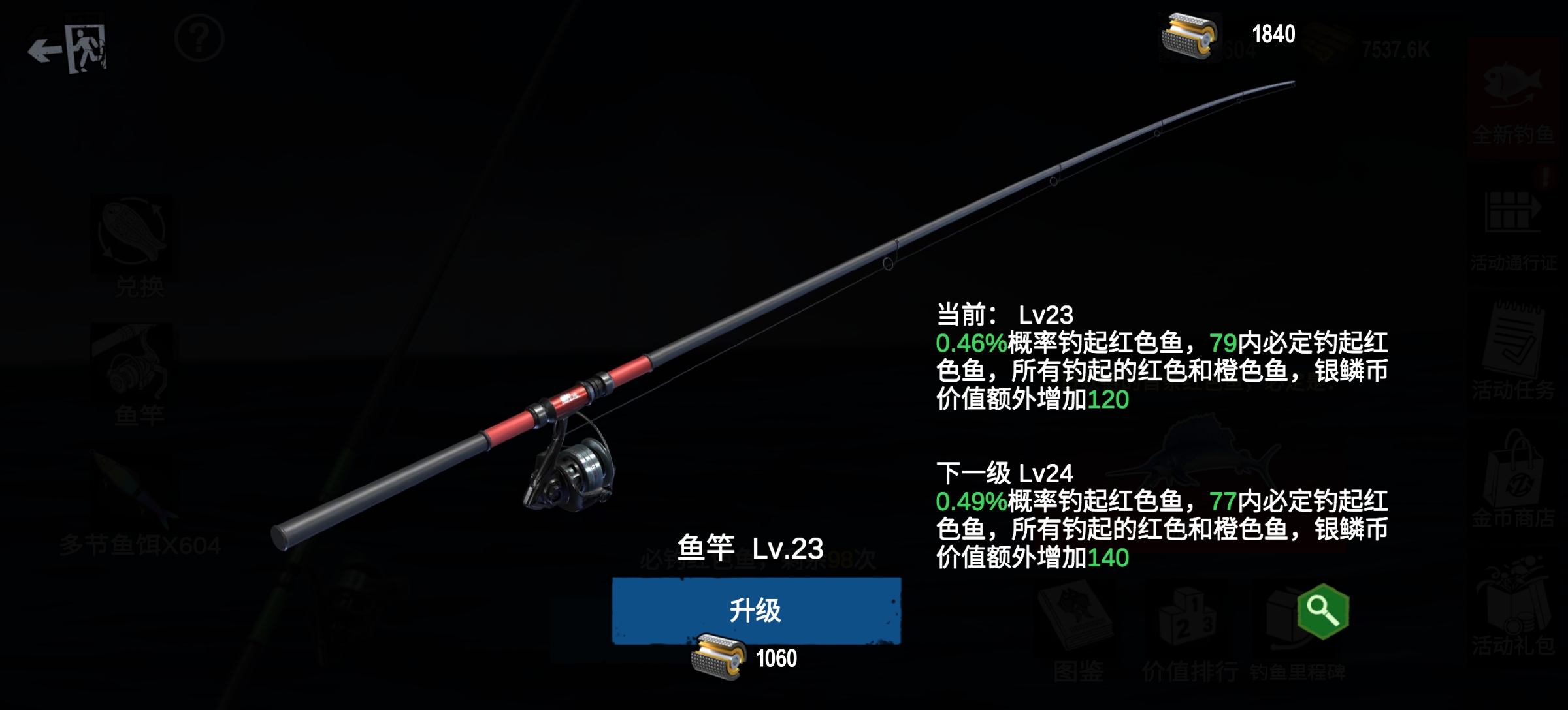 本期活动不再细分鱼竿部位、鱼饵种类以及钓鱼场景,全部统一。钓鱼概率中橙色鱼概率固定为12%,紫色鱼固定为60%,红色鱼根据鱼竿等级决定,剩下的则为蓝色鱼概率。