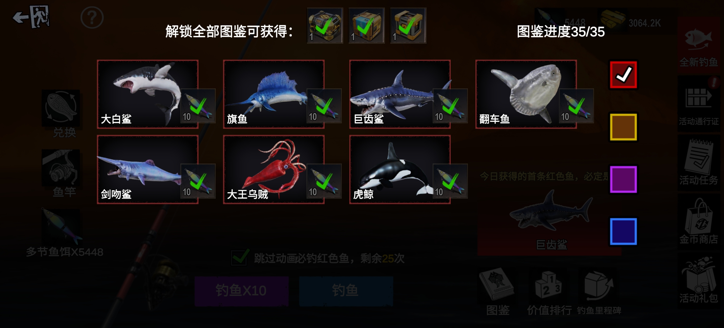 解锁不同鱼图鉴,可获得对应奖励,所有图鉴均解锁后还可获得大奖。配合每日首条红鱼种类,能更便捷解锁图鉴。